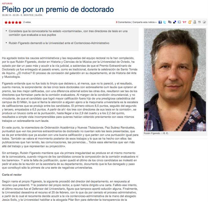 Intentando que la pureza del procedimiento de prestigio a unos premios que valoran la excelencia científica y no las influencias, Rubén Figaredo entabló un proceso, primero administrativo y actualmente judicial, con la intención de revocar un Premio Extraordinario de Doctorado que considera oscurantista en su convocatoria, arbitrario en su procedimiento y discutible en su fallo. Sin la intención de reclamar un premio para si, sino la de trabajar para que los que vengan detrás se encuentren con una universidad en la que la transparencia y la igualdad de oportunidades resplandezcan, y desaparezcan para siempre la endogamia, el nepotismo y la ocultación de una reglas del juego que tienen que ser válidas para todos.